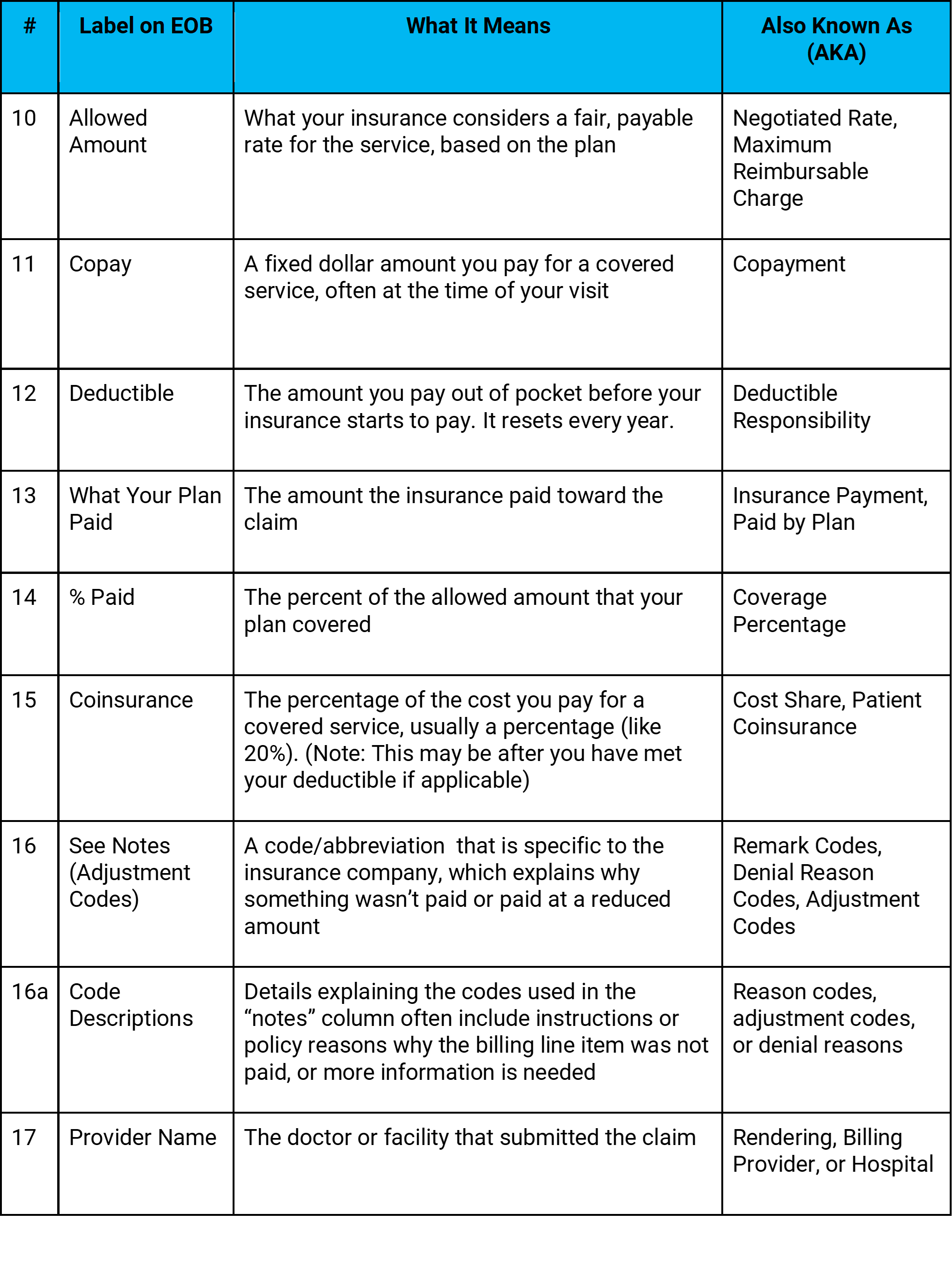 💡 Pro Tip: The reason codes or notes are often abbreviated and can be difficult to interpret. But most insurance companies include a glossary on the back of the EOB or online. Use it!