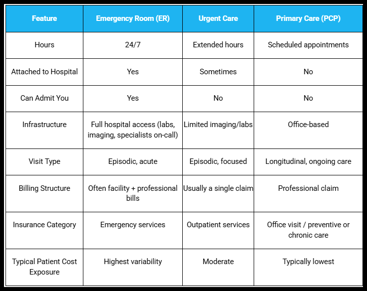 How ER, Urgent Care, and Primary Care (PCP) Work Behind the Scenes — and Why It Affects Your Coverage